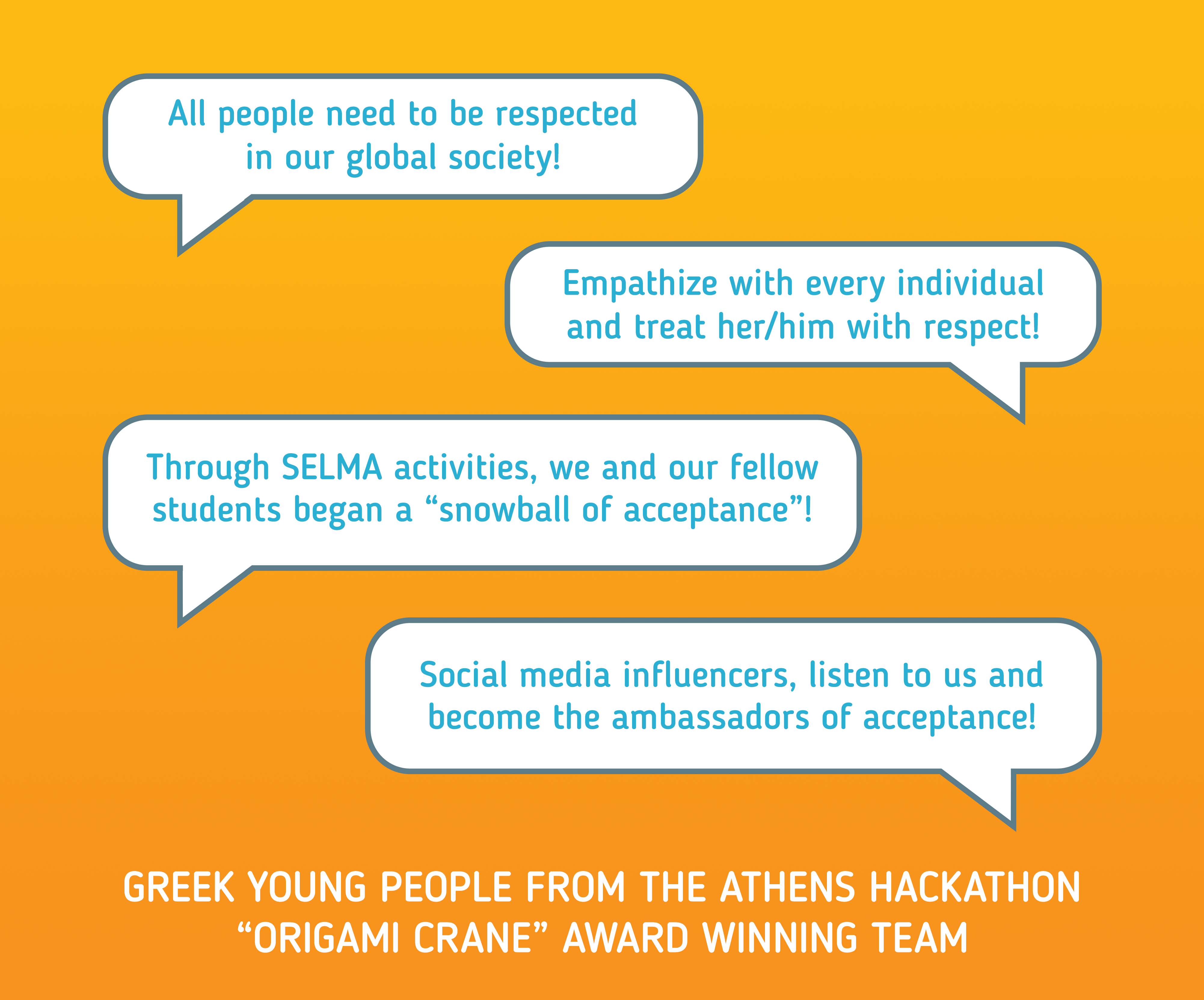 The Greek SELMA partner FAH asked a group young people that won a SELMA competition in Greece about their thoughts on online hate speech and the impact of SELMA. In the image below you can find their answers. If you want to learn more about young people’s views on this issue, read this article with their ideas for producing and promoting hate speech counter-narratives.